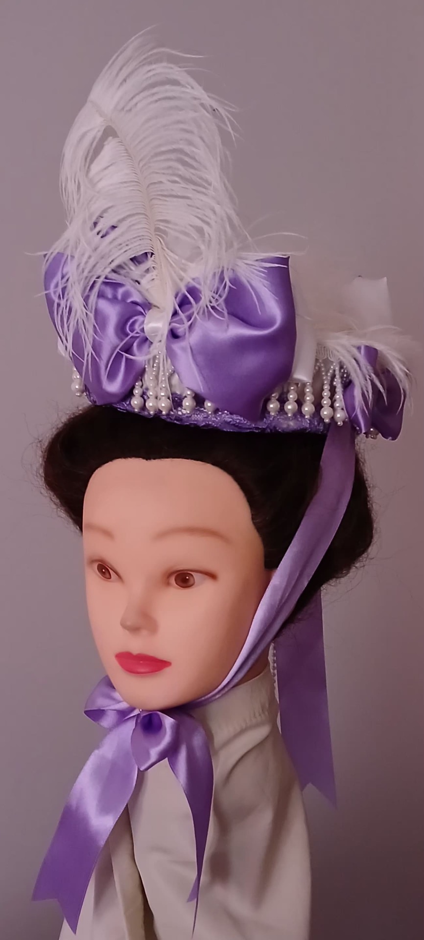 Elegant petit chapeau d'inspiration Victorienne, habillé de satin blanc et d'un rebord en dentelle violette.