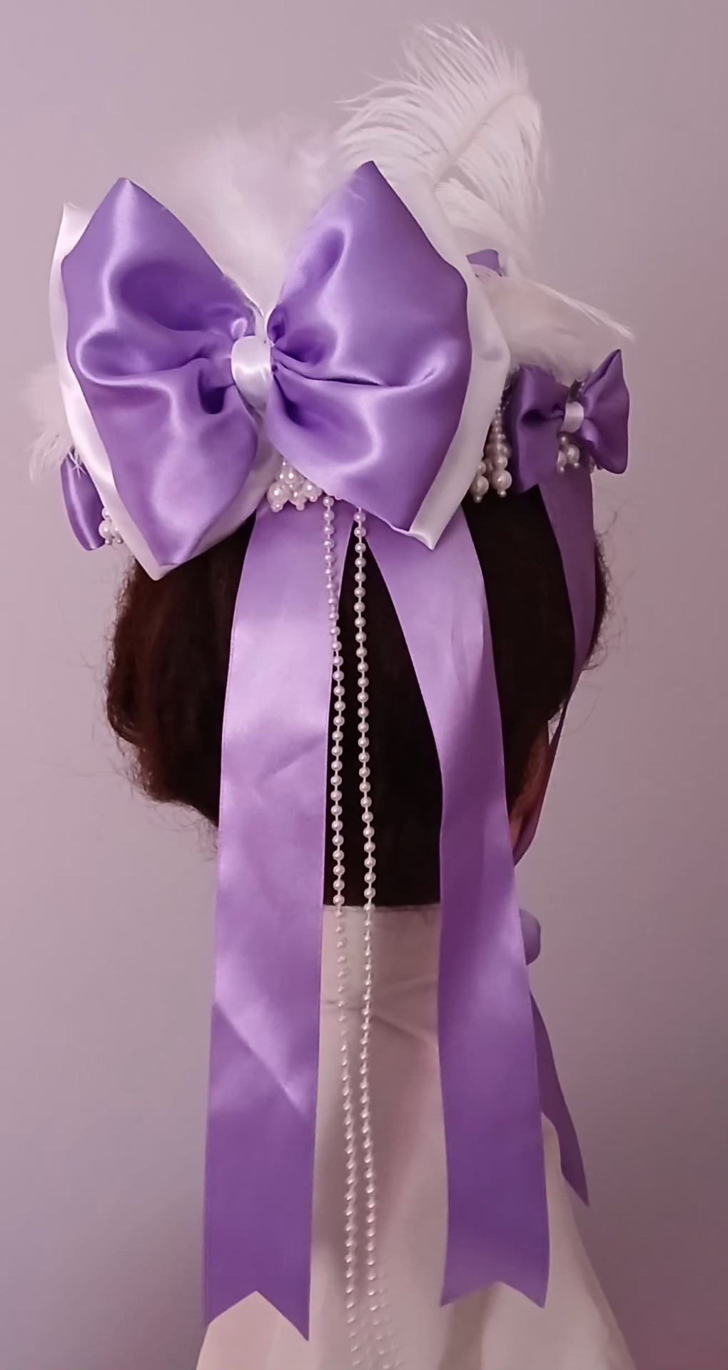 Au dos, un double-noeud en satin violet/blanc/ruban satin blanc cousu main sur deux rubans en satin violet et des perles blanches.