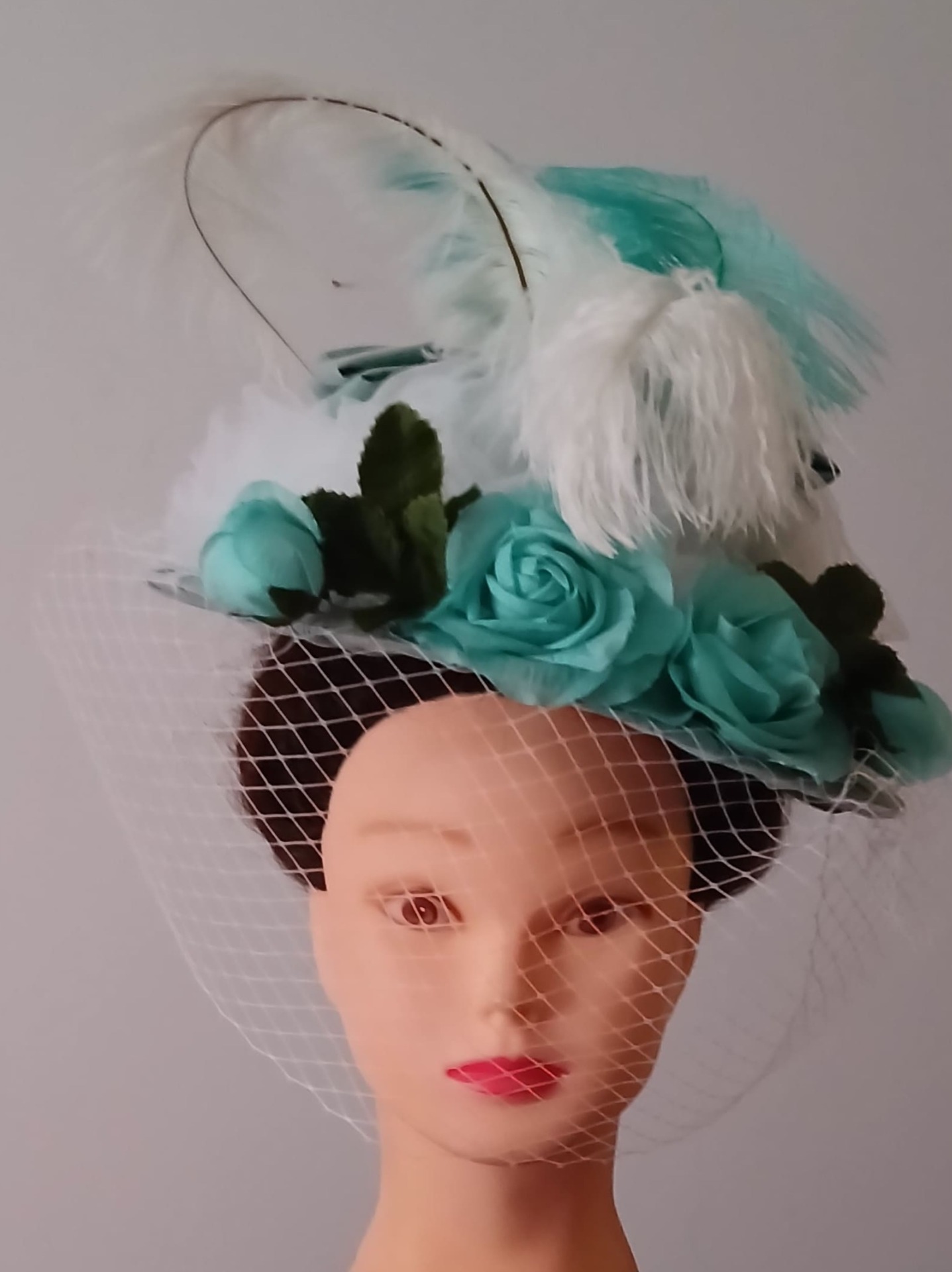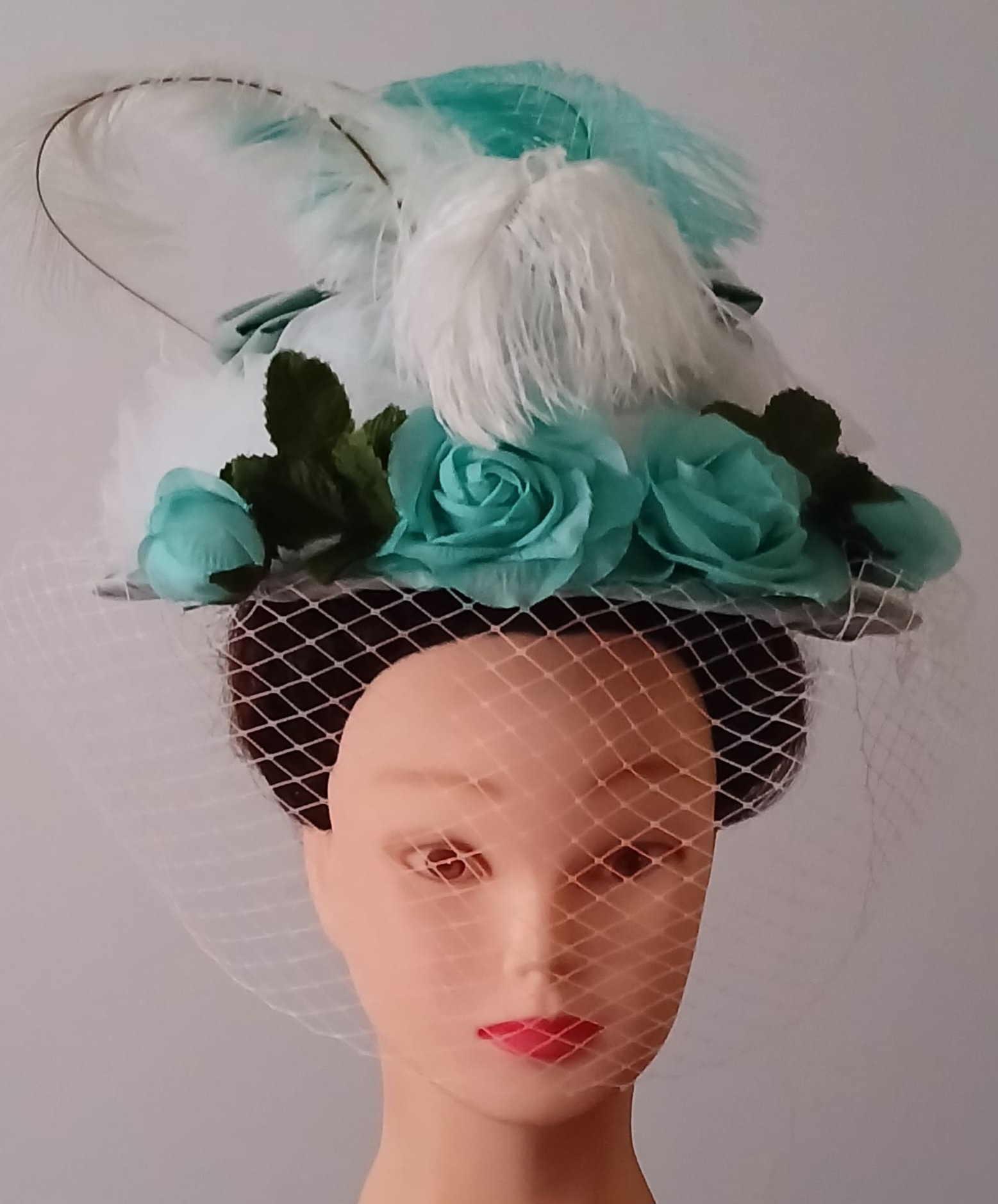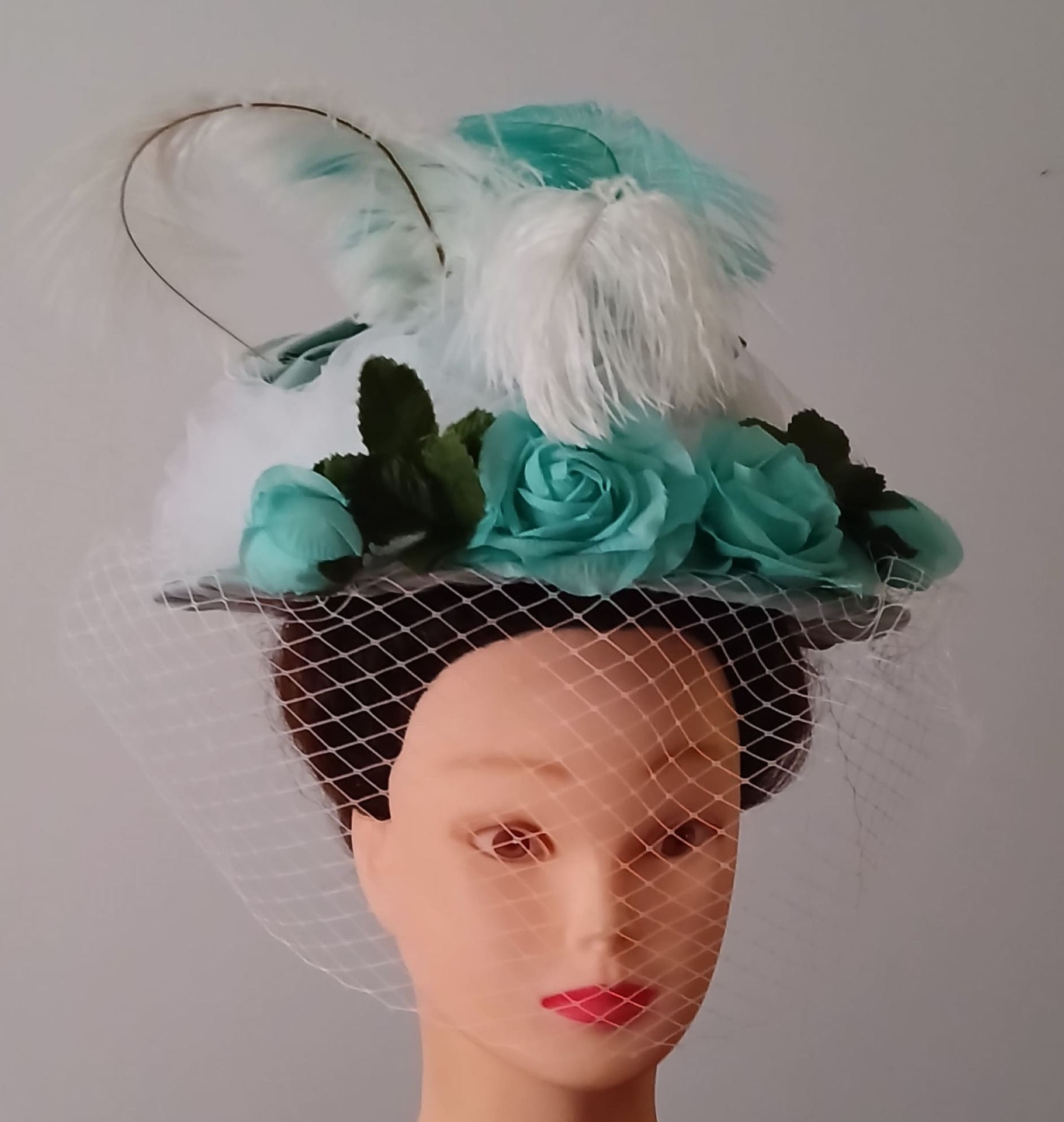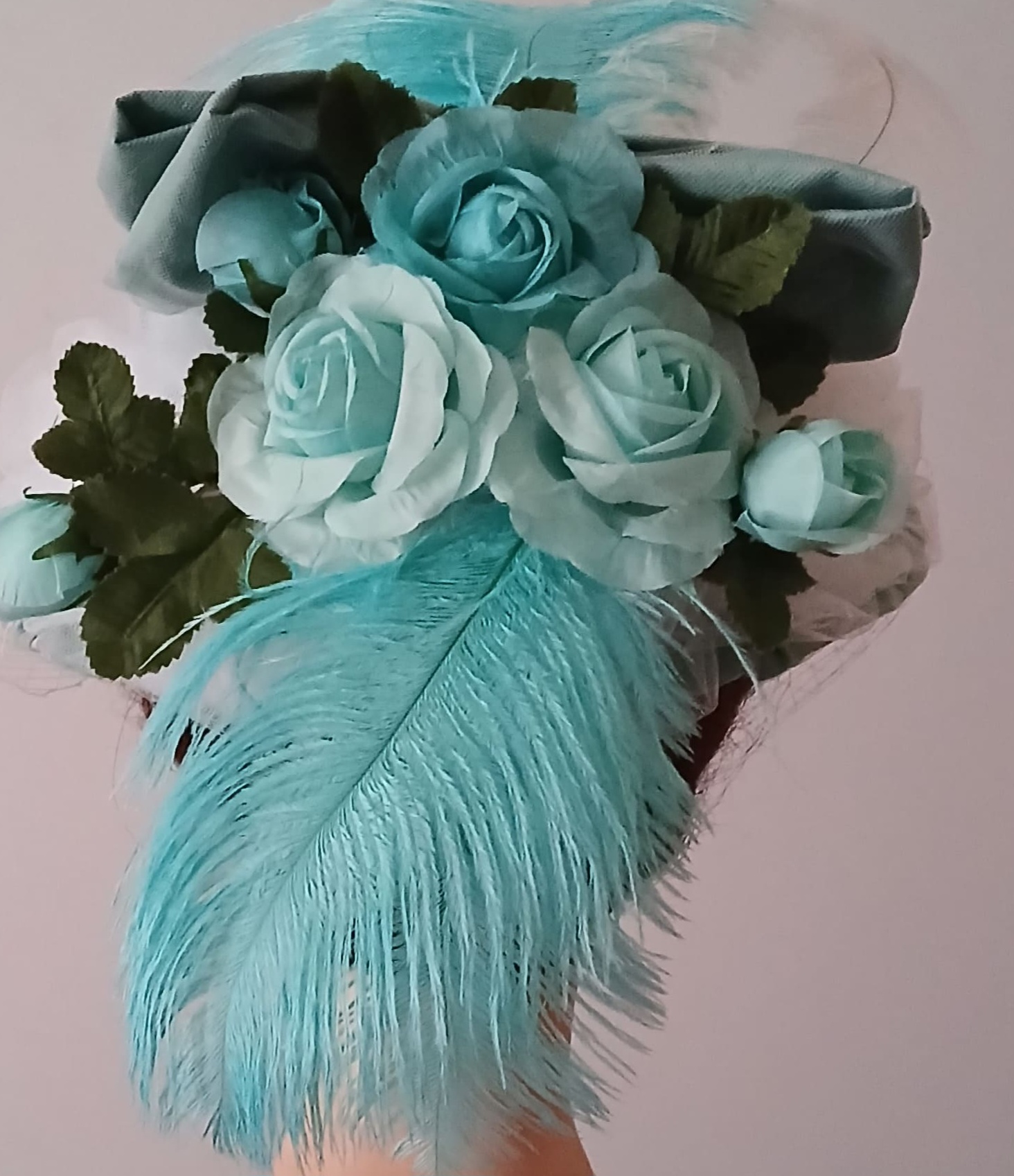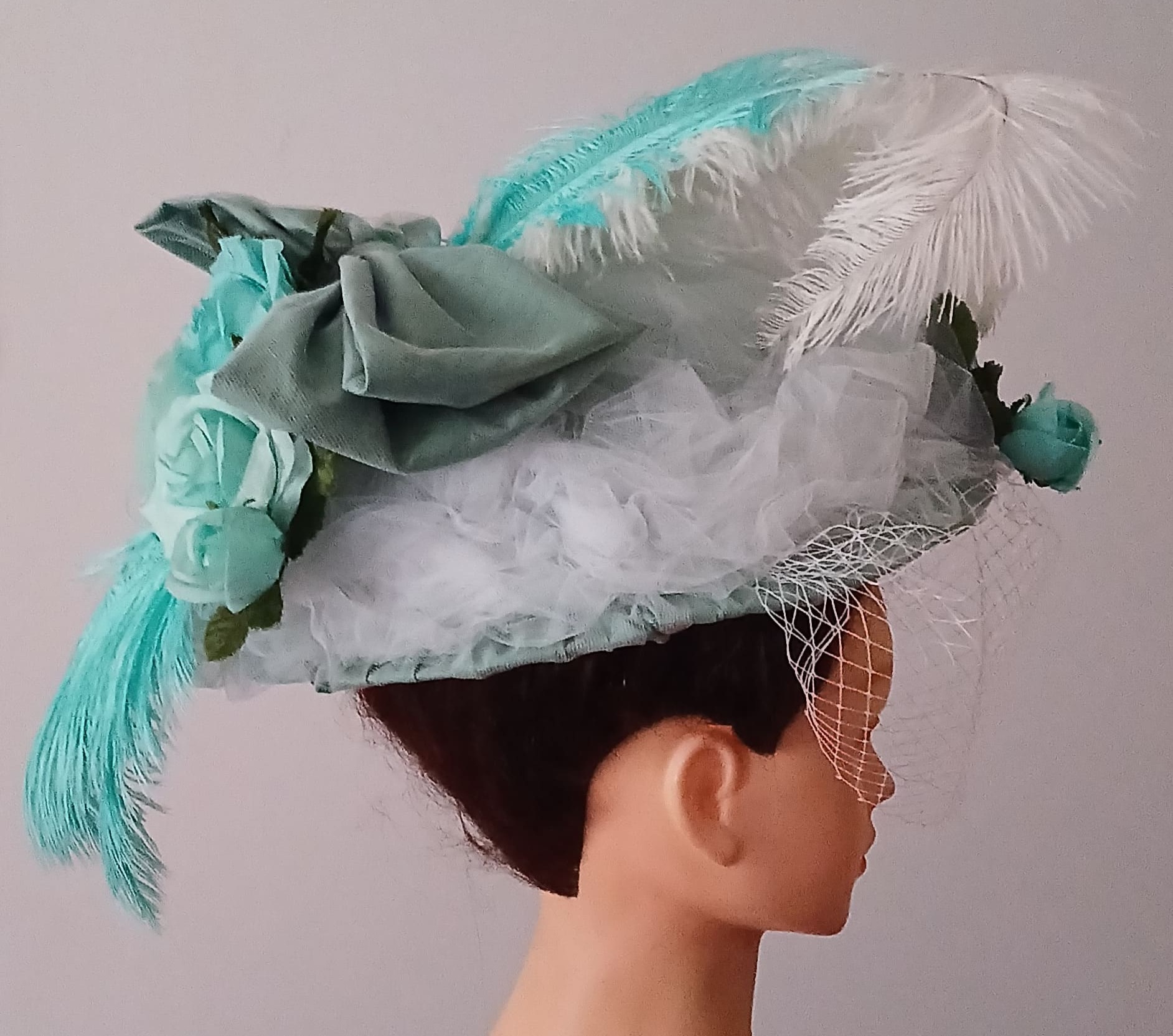 Roses en soie verte, plumes d'autruche blanches et teintées vert.