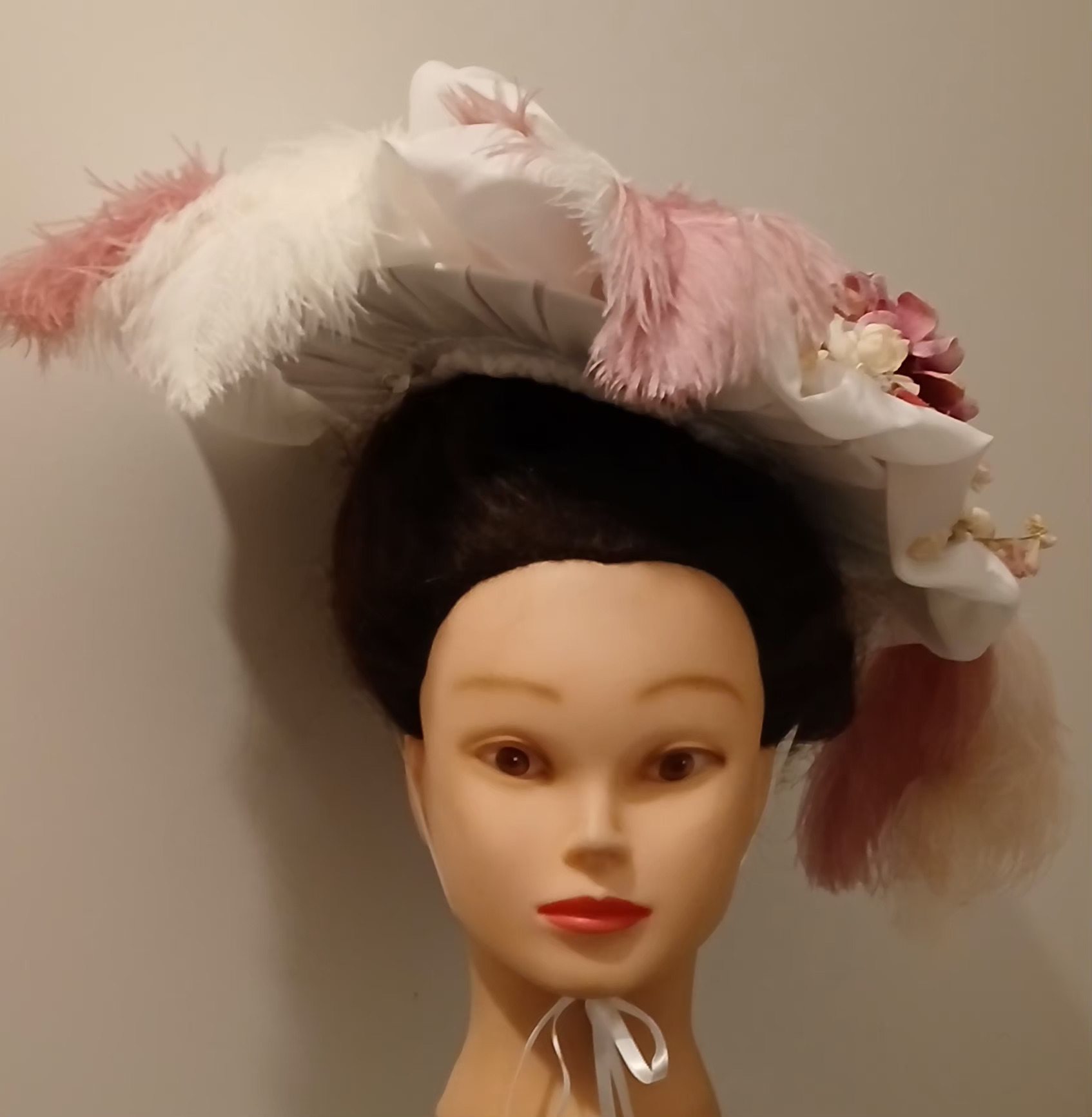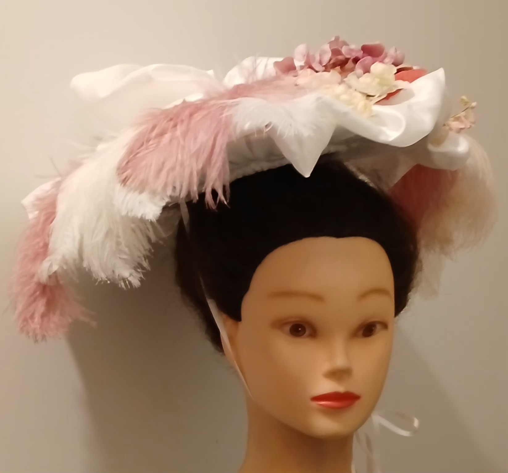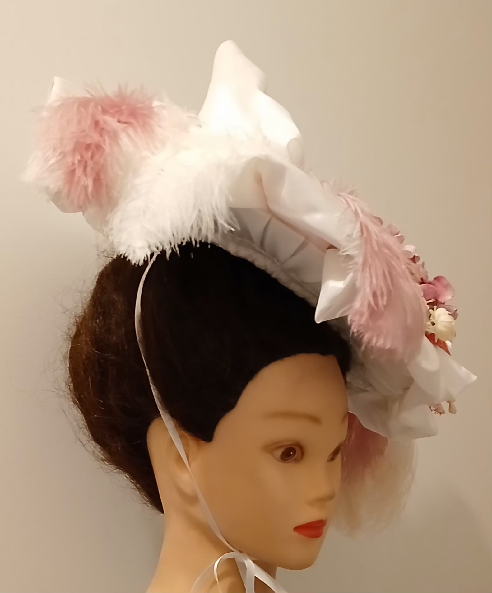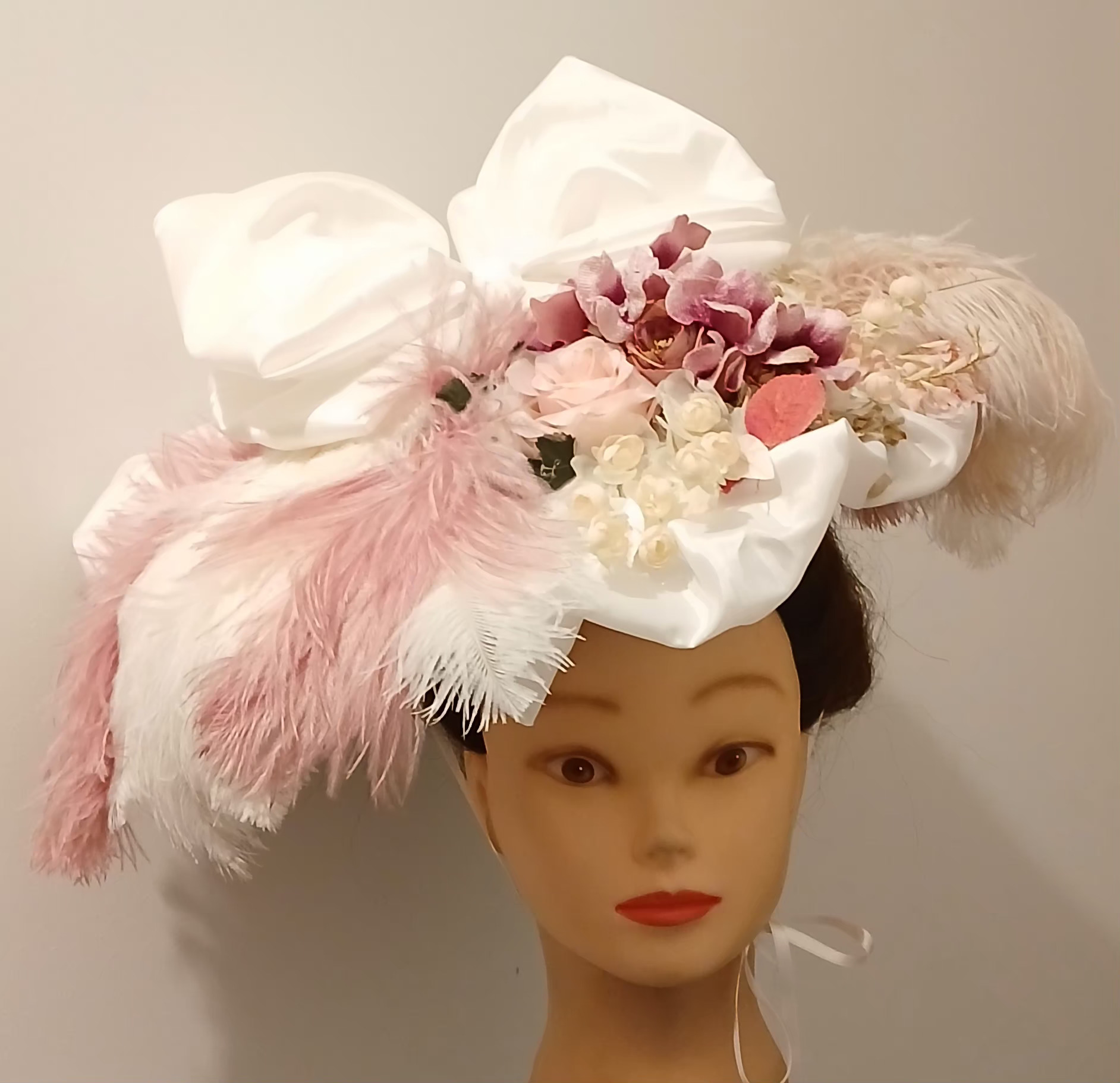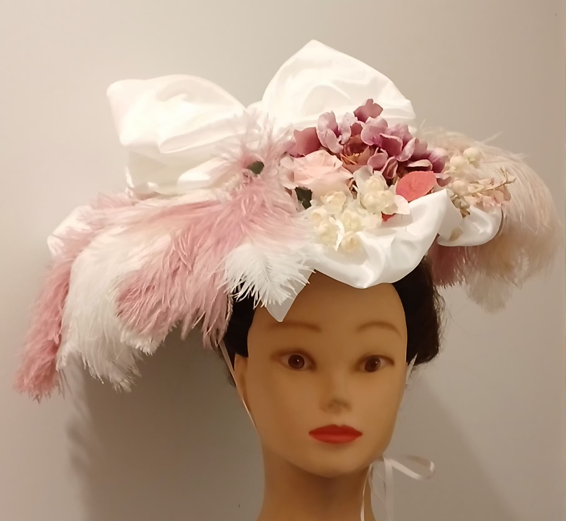 Orné d'un double-noeud sur le dessus et de deux fleurs en satin au dos, Il est agrémenté de plumes d’autruche et d’un bouquet fleuri en camaïeu de rose : roses en soie, fleurs anciennes et hortensias en tissu.