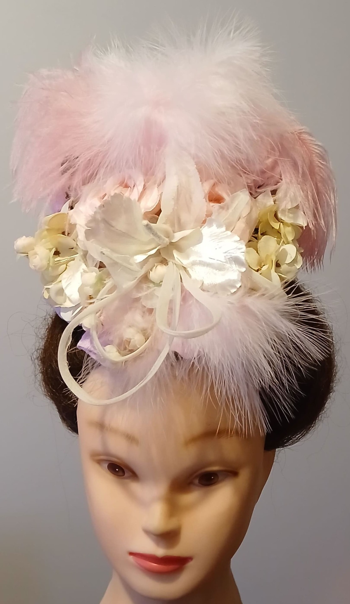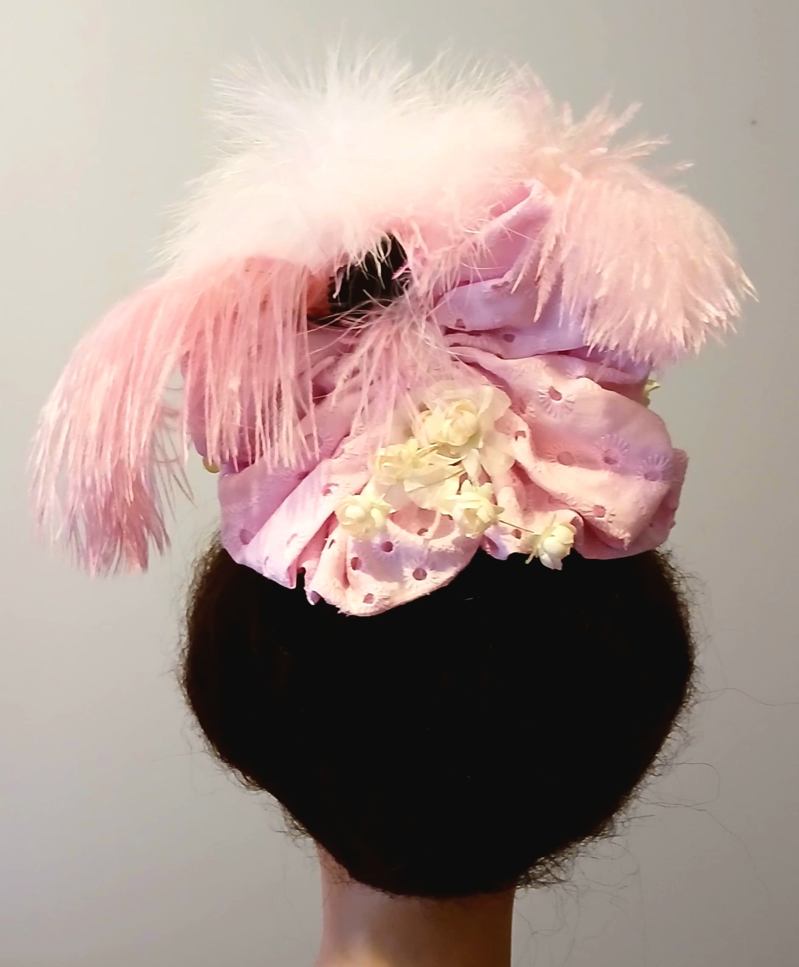 Bibi orné de broderie anglaise rose et d'un nœud assorti cousu main à l'arrière, agrémenté d'un bouquet de petites fleurs beiges et de deux roses en tissu rose.