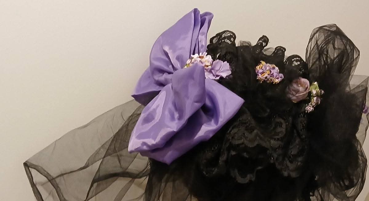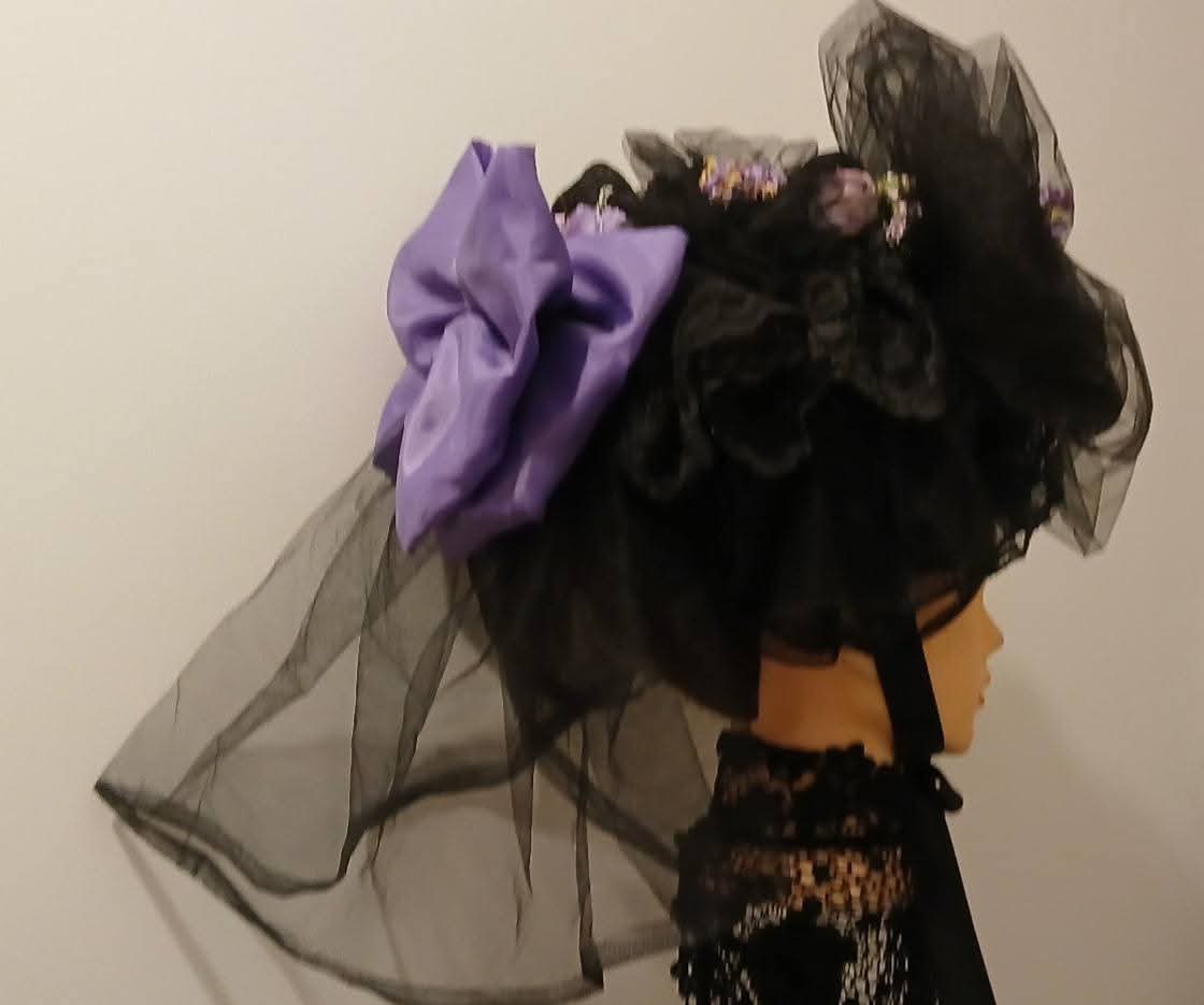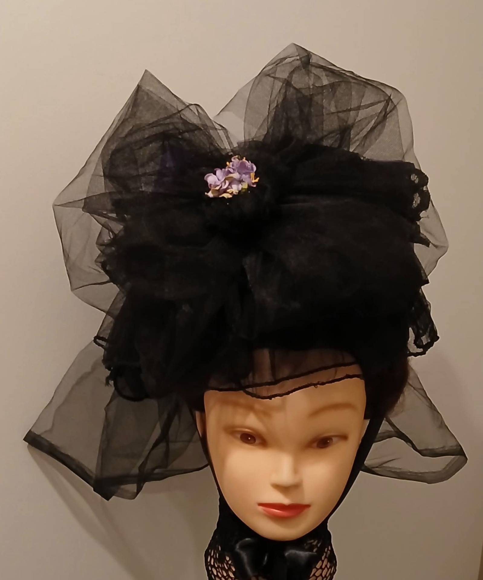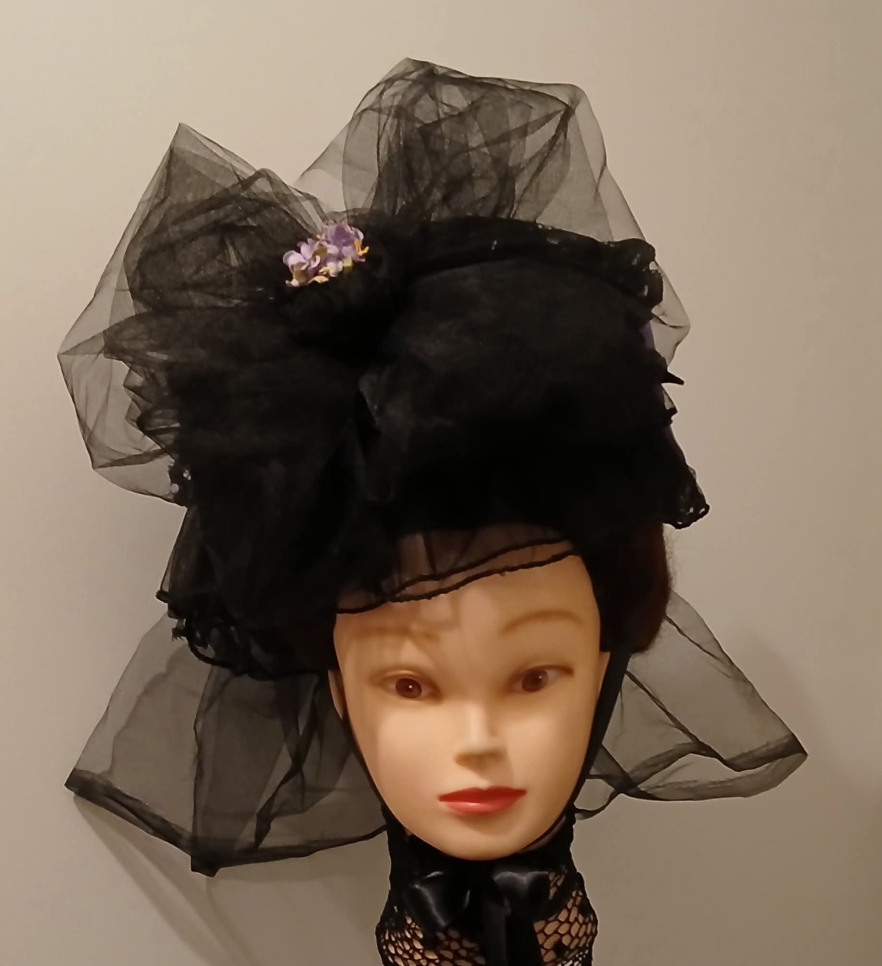Héloria, chapeau de style Victorien ou Gothique Victorien habillé de taffetas noir.