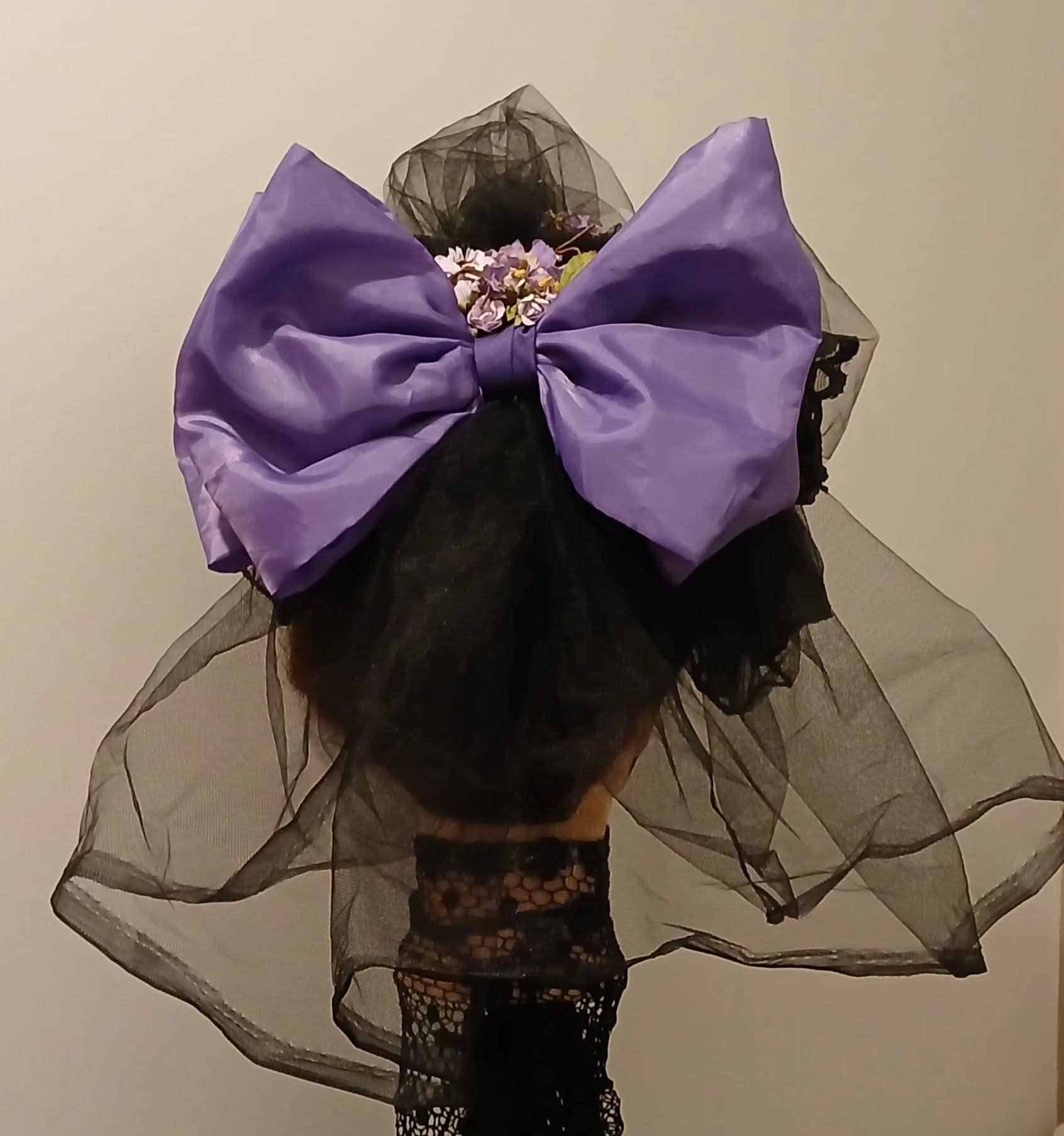 Entouré de volants en tulle noir et en dentelle noir, il dispose d'un gros noeud en tulle noir et sa fleur coordonnée, ornée de petites fleurs en tissu violet.