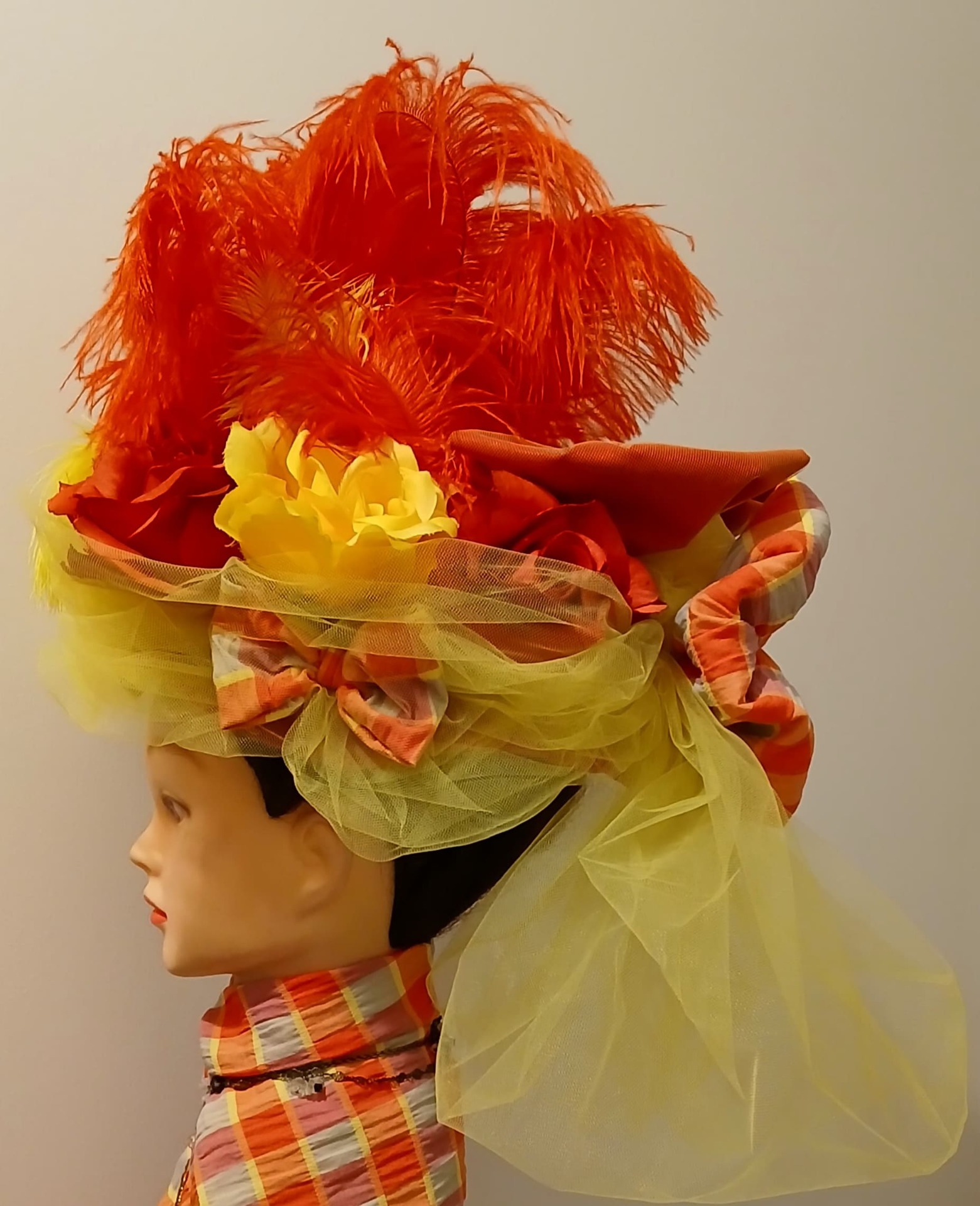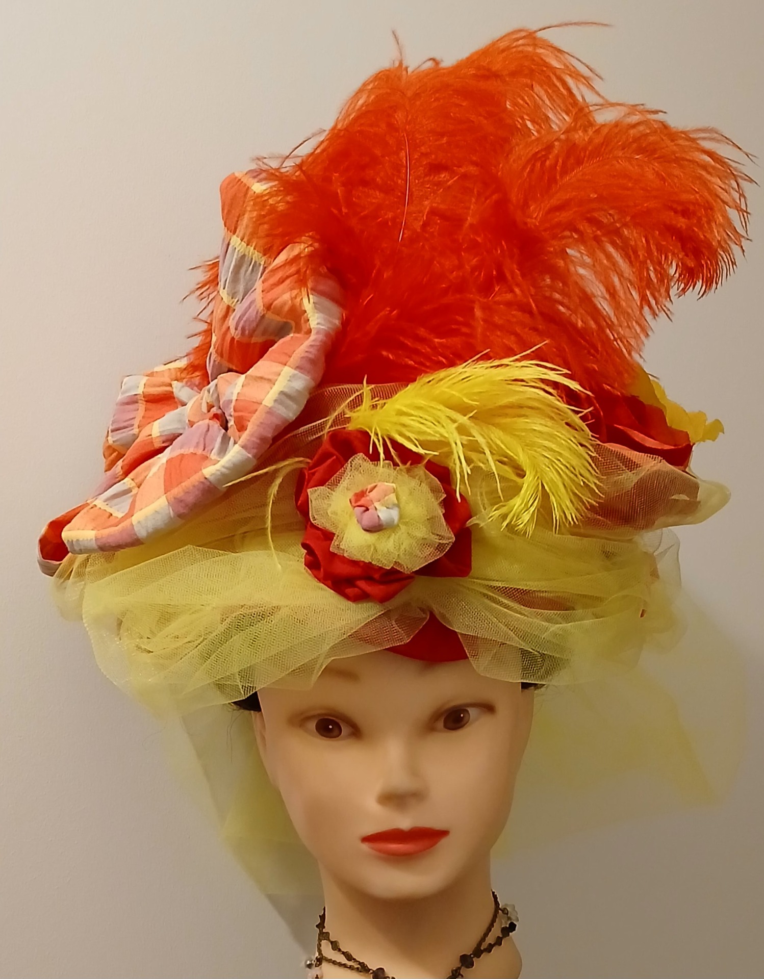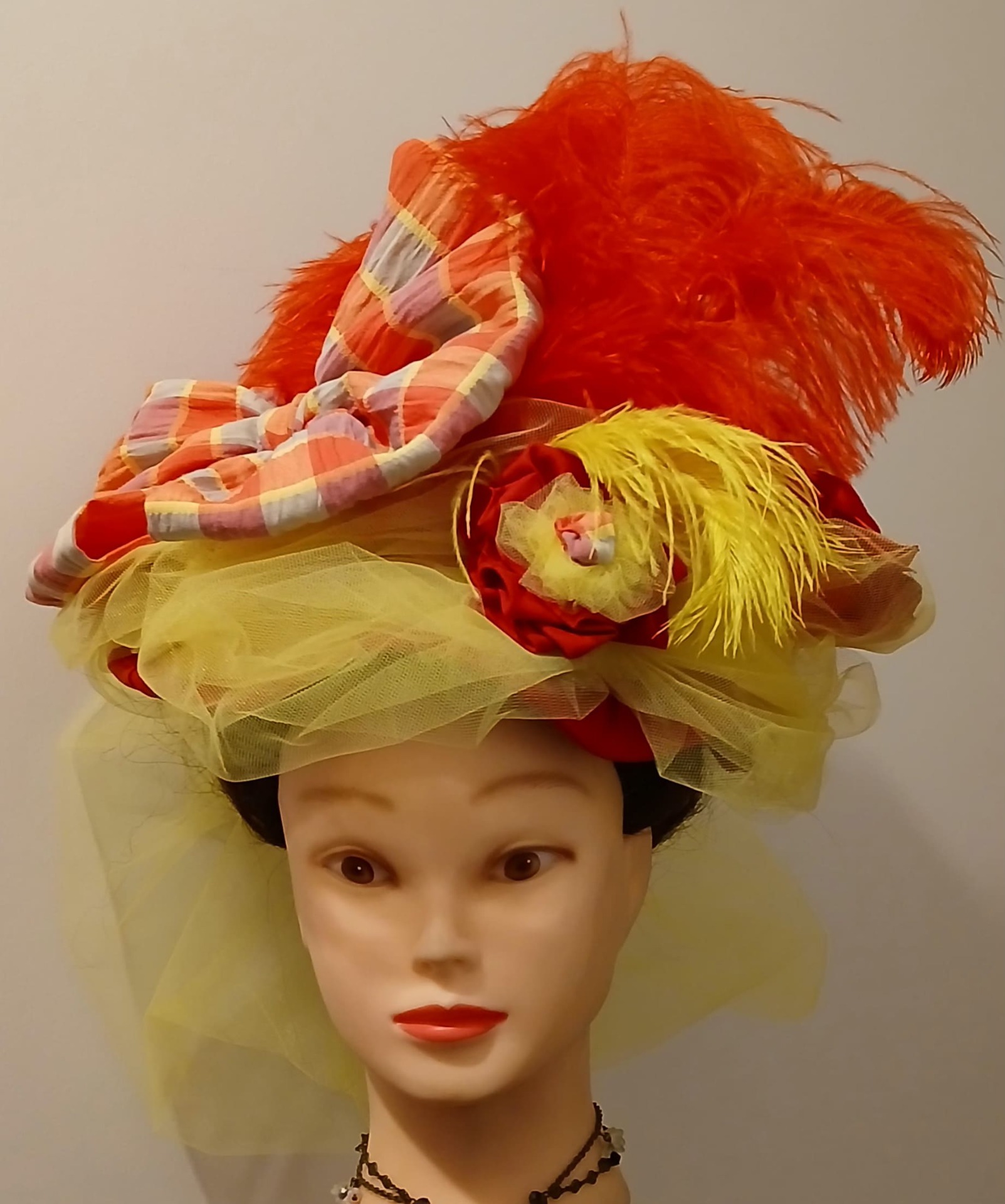 Lauréande, chapeau de style Victorien habillé de coton rouge et orné de tulle jaune.