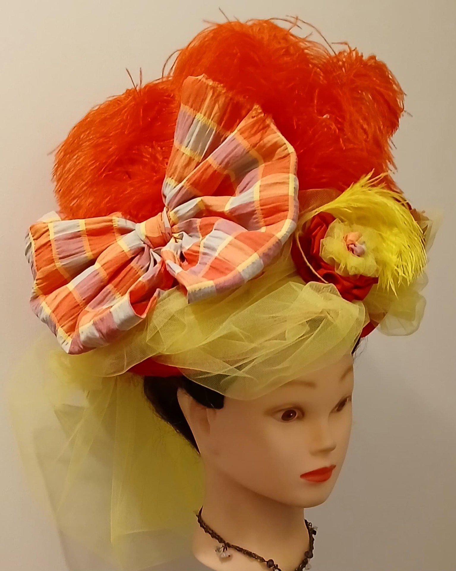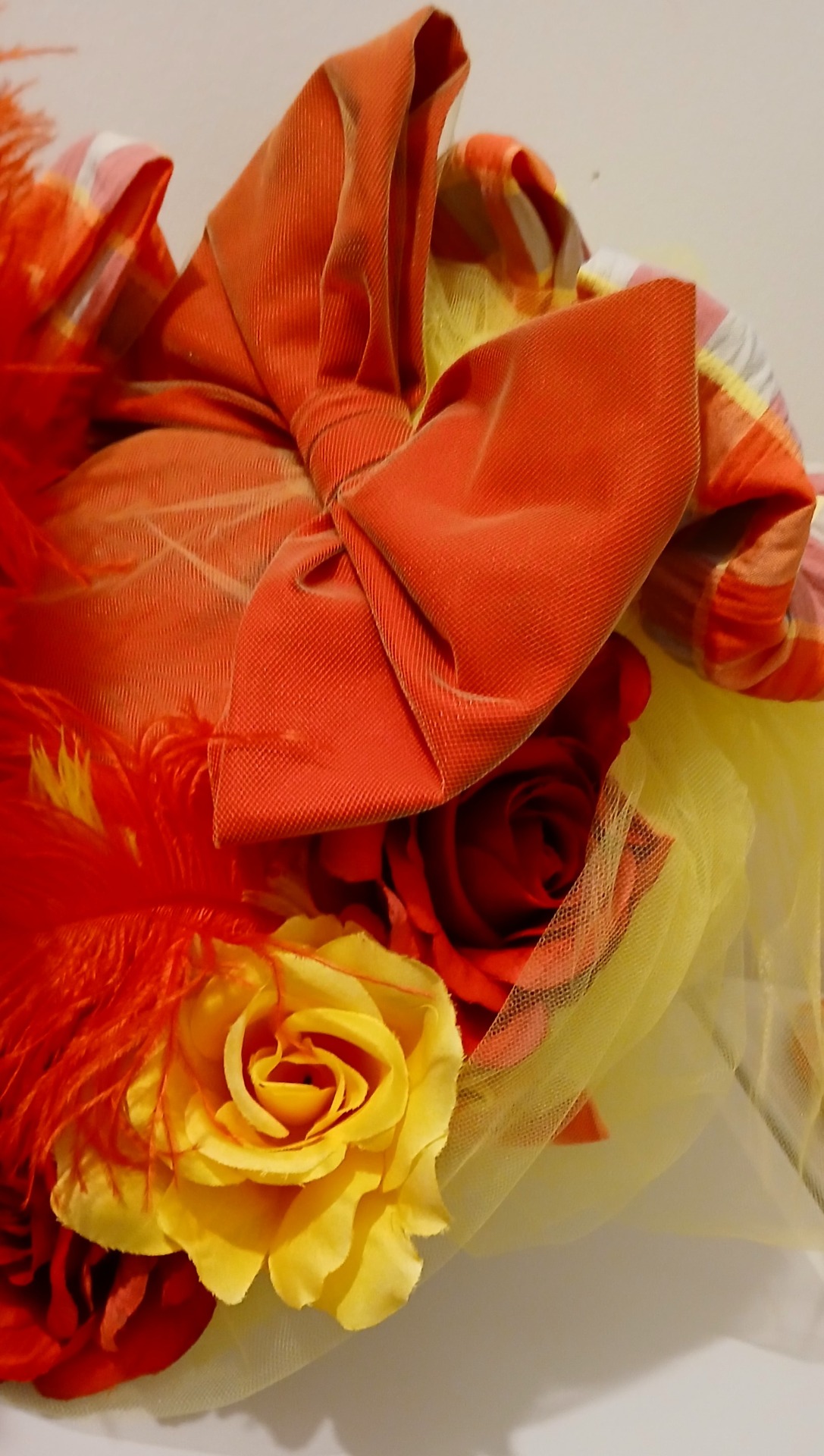 Deux roses en tissu rouge et une en tissu jaune sur le côté gauche, une plume d'autruche teintée rouge et deux teintées jaune, ainsi qu'un petit noeud multicolore.