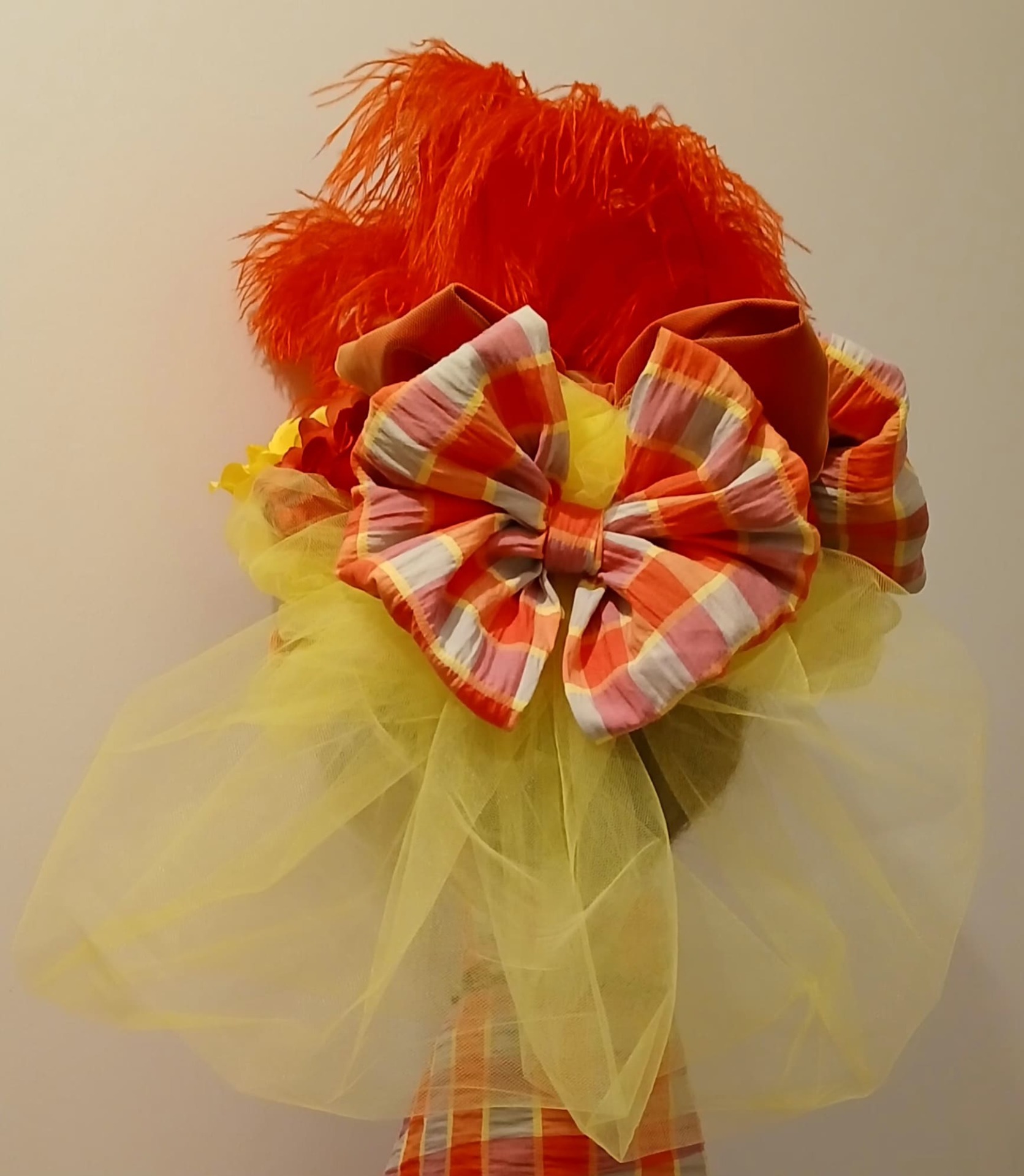Un noeud a carreaux multicolore sur le côté droit, avec une rose en tissu rouge et ses plumes d'autruche teintées rouge.